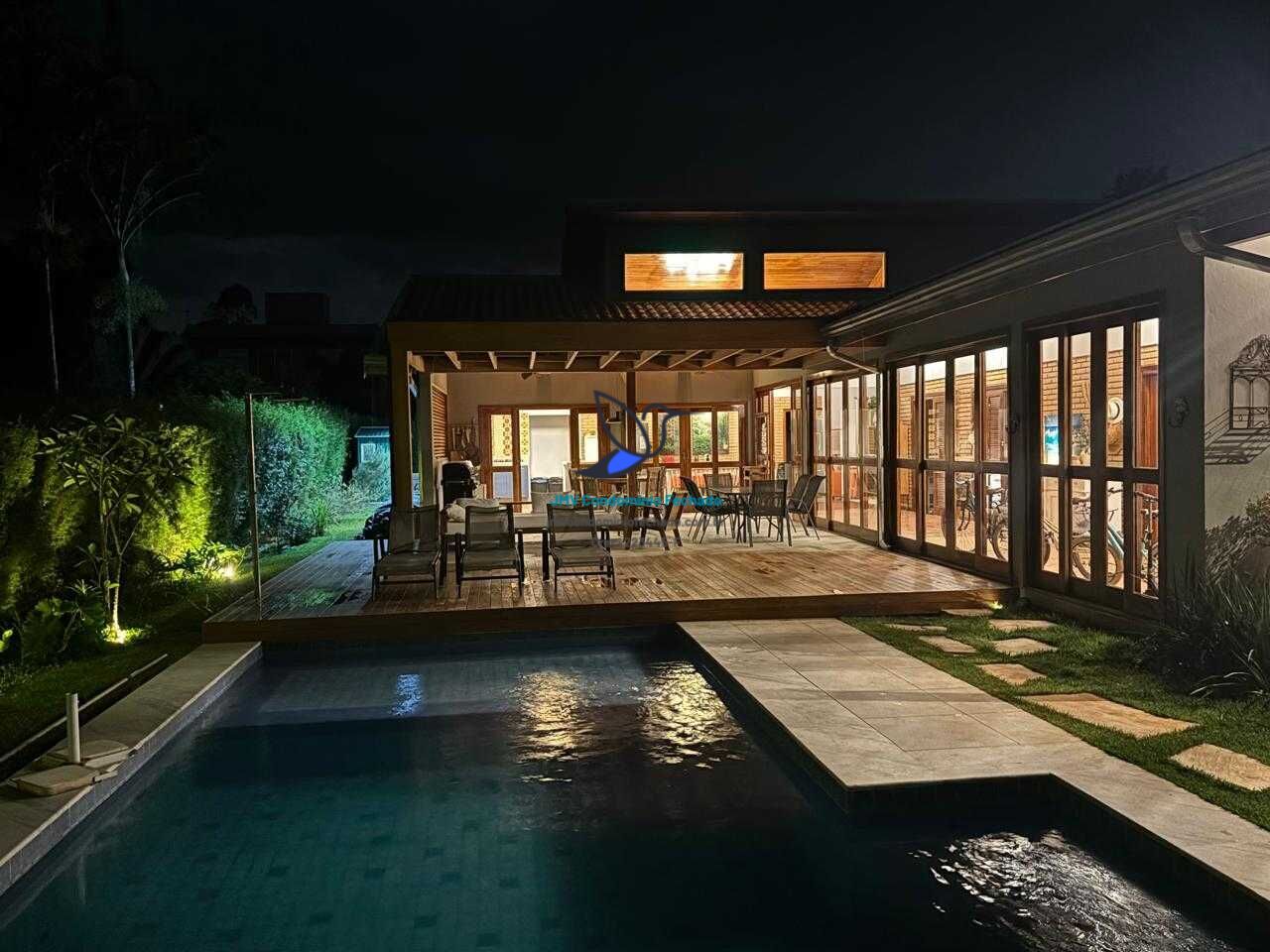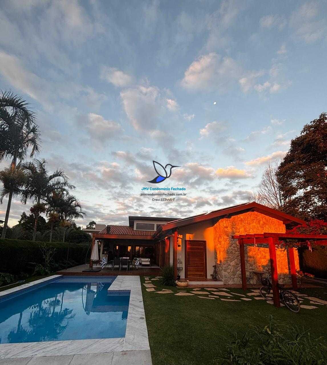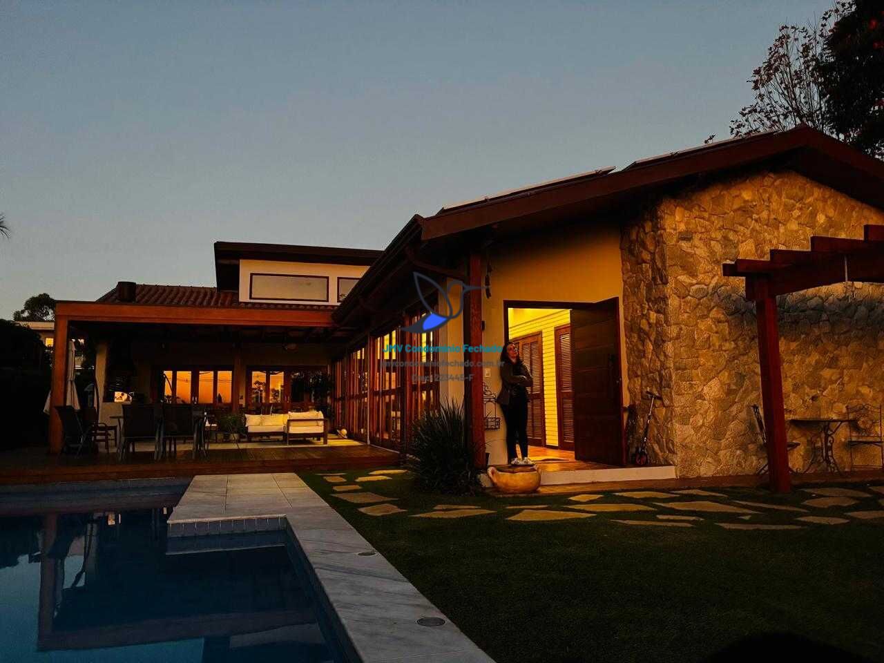Casa térrea muito aconchegante e confortável, com 4 suítes, salas de estar/jantar e área gourmet integrados, piscina e paisagismo exuberante voltados para o pôr do Sol e área verde preservada do condomínio.